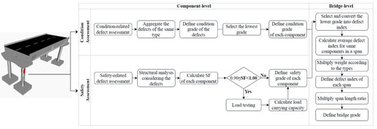 27]. According to these criteria, condition assessment is initially conducted through visual inspections at a six-month interval, and “precise safety inspection,” including safety assessment, is performed at intervals ranging from 1 to 4 years, depending on the grade and age of bridges. Moreover, for high-importance bridges or bridges with compromised safety, a “precise safety diagnosis” (
