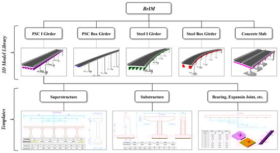 22]. By referring to this method, BrIM proposed in this study was designed to generate 3D bridge models based on predefined data templates (with a modeling library) and gather data from the FMS. The templates included fundamental information regarding the superstructure and substructure types and dimensions, as listed in