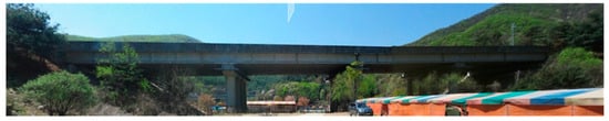 Figure 10. This bridge was constructed in 2001 and is located on a major highway connecting Seoul to the southern region of South Korea. The total length of the bridge is 120 m, with a width of 12.15 m, and it consists of four spans, each with a length of 30 m. Five inspection records from 2012 to 2018 were available in the FMS, and these records were analyzed for entering data into the BrIM (any information prior to this period was stored separately by regional offices and was not considered for this study, as no significant damage was identified). The analysis results revealed some damage, such as cracks, on the main components, as well as damage to expansion joints and bridge bearings. The records were rewritten in accordance with the template and entered into the BrIM. Additionally, image data were acquired through UAV and GPR scanning, and these data sets were also incorporated into the BrIM.