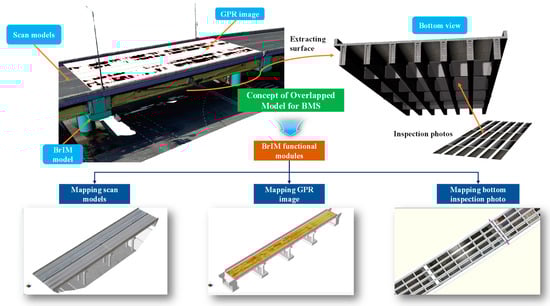 In this study, a BrIM-based BMS was established for existing bridges constructed without BIM technology. During the planning, interviews were conducted with bridge owners, managers, and site inspectors, obtaining information and functional requirements. The requirements were used to design the system architecture of the BrIM-based BMS, facilitating data exchange with the existing FMS. By considering a model library and templates, data-driven modeling with fundamental bridge data was also achieved according to the requirements of avoiding duplicate works and fast modeling. Users thereby could complete BrIM within a few minutes, even for those unfamiliar with BIMs. An inventory code system was incorporated to ensure effective data management, enabling the organized storage and retrieval of not only the maintenance history but also new inspection data. This code system also facilitates the automatic aggregation and quantification of defect data and is used in the condition and safety assessment process defined under national maintenance guidelines. Based on three types of image sources (UAVs, GPR, and damage maps), image mapping methods with different approaches were applied to visualize the inspected data. In particular, for scan models from UAVs, deep learning-based damage vectorization was introduced, which enabled quantification and modeling of the damage, and subsequently, in-depth discussions regarding the difficulties and possibilities were conducted. Functionalities for supporting decision-making were also considered by providing visualizations, dashboards, and reporting systems. The aggregated inspection data and damage index of each bridge component are summarized according to a predefined reporting format and visualized in the model. Therefore, users can easily confirm bridge conditions, and the dashboard can provide many different insights based on the choice of data that users want to view.