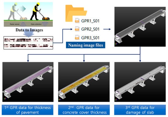 Figure 4. Subsequently, images from three different sources (GPR, UAVs, and damage maps) were mapped onto the surfaces, as shown in