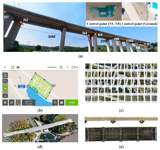 Figure 13, was devised. Although drones are equipped with Global Positioning System (GPS) devices, their effectiveness in constructing precise scan models is limited owing to the GPS signal loss experienced under superstructures. Consequently, the control points were strategically positioned on both the bridge and ground. Considering factors such as the surrounding terrain, altitude, and target precision, flight paths were meticulously established. Subsequently, the UAV-captured photos were acquired with a vertical overlap of 60% and a horizontal overlap of 80% to enhance the quality of the scan models and were converted into 3D scan models using the commercial software ContextCapture [