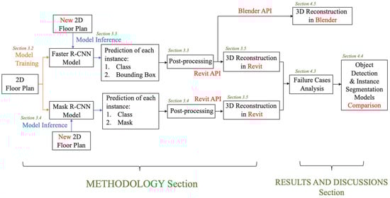 This section covers the data generation process, neural network training, inference, post-processing, and 3D model reconstruction in Revit 2022 for both object detection and instance segmentation tasks, as shown in Figure 1.