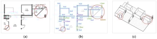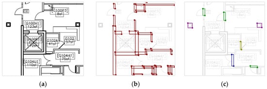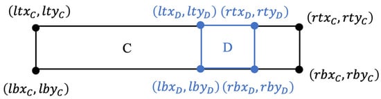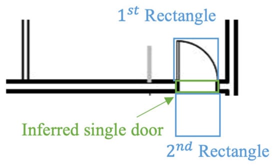 For horizontal door D in “Object Detection Array”, its host wall C was searched in “Object Detection Post-Merging Array”, as shown in Figure 15. There were four rules that needed to be followed. First, both C and D were horizontal instances. Secondly, instance D belonged to one of the left-hand door, right-hand door, and double door classes. Thirdly, was larger than and smaller than . Lastly, the difference between and was less than 10 pixels. If an instance C was discovered following these four criteria, two actions were taken. First, the index value of the D instance in “Object Detection Array” was set to be the same as the index value of the C instance in “Object Detection Post-Merging Array”. Next, the D instance in “Object Detection Array” was appended to “Object Detection Post-Merging Array”. For the vertical instances, the horizontal pairing pipeline was repeated for the vertical door and host wall pairs.