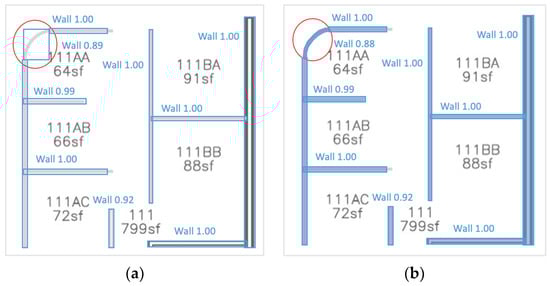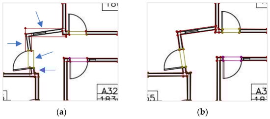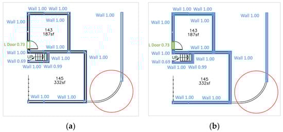 The thickness of wall instances. The thickness of all wall instances in the 3D reconstruction model is the same constant value since their length is only defined by giving the value of , , , . Figure 36a shows that the thickness of the wall instance can be recognized with a purple circle indication, but this information is ignored to construct the 3D model in Figure 36b. This can be solved by expanding the Revit 2022 reconstruction script with additional functionalities offered by the Revit API 2022 so that the model would be more customized.