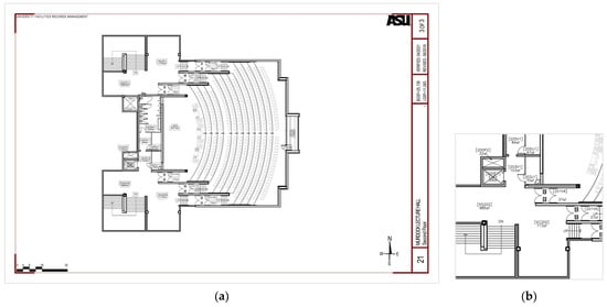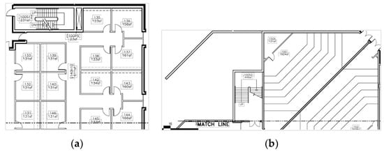 In this study, 2D architectural drawings of Arizona State University Tempe campus buildings were provided by the University Facilities Management department. The dataset comprised AutoCAD files along with their corresponding PDF counterparts. The 29 of these PDF files were transformed into JPG format, each with dimensions of 3400 × 2200 pixels, constituting the original dataset. This original dataset was then split into a training set of 21 sheets and a validation set with 8 sheets. To conduct supervised learning tasks, the dataset was annotated using the LabelMe annotation tool []. The annotation process involved determining the class taxonomy and annotation format and technique.