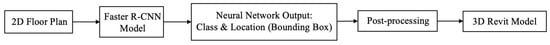 After getting the Faster R-CNN trained model, object detection inference on the new 2D floor plan was executed. The detection model output the class and bounding box information of each predicted instance. Three post-processing steps were then conducted to create 3D models, as shown in Figure 6. The post-processing steps include coordinate system transformation, merging adjacent instances, and pairing door and host wall. For the detailed pipeline, please refer to Figure A1.