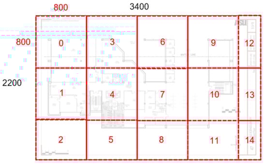 800 × 800 pixels sliding windows sequence cropping for 3400 × 2200 pixels floor plan. (The numbers 1 to 14 indicate the sequence of crops).