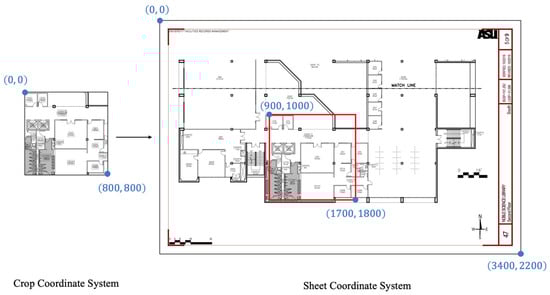 To perform model inference on a new floor plan, each drawing was partitioned into 800 × 800 pixels crops in a sliding window sequence, as shown in Figure 7. This cropping was necessary to match the data input size formatting requirement of the deep learning algorithms that were set during the training process. The inference on each crop was run using the trained Faster R-CNN model(s) outputting (1) crop index (the number inside each crop in Figure 7), (2) class, (3) confidence probability, (4) bounding box coordinates, top left corner, and bottom right corner coordinates.