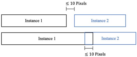 The next step was merging the adjacent instances since the continuation of wall instances across crop boundaries assumption was made, Figure 11b replaced by Figure 11a. This merging step first separates the horizontal object instances from the vertical object instances. If the width of the instance is larger than its height, it is determined as horizontal and vice versa. All instances were looped through in “Object Detection Array Duplicate” and merged adjacent instances if their coordinates were within a threshold proximity, set as 10 pixels through trial-and-error. The trial-and-error process is recommended to determine the appropriate threshold for different sizes of drawings. Proximity refers to both a threshold gap and threshold overlap, as shown in Figure 12. Prior to merging the instances, the instance was checked to establish whether it had horizontal or vertical shape.