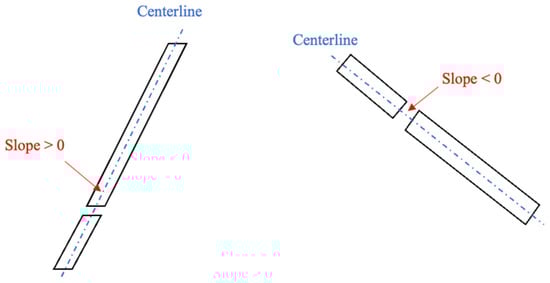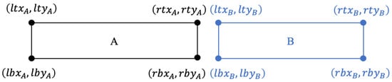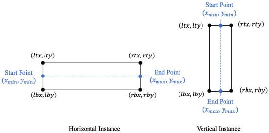 If instance B conforming to these five requirements was found, three manipulations to A and B instances in “Object Detection Array Duplicate” were conducted. First, equal to , equal to , equal to and equal to were set, which indicates that A merged into B. Secondly, the class of instance B to be the wall class was set. Lastly, instance A in “Object Detection Array Duplicate” was removed. For the vertical instances, the horizontal merging pipeline was repeated for the vertical bounding boxes.