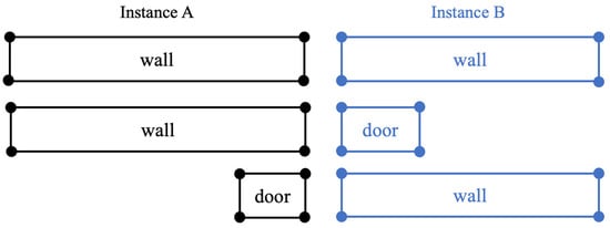 For horizontal instance A in “Object Detection Array Duplicate”, another adjacent horizontal instance B was searched on the positive direction of the x-axis with a larger x value in “Object Detection Array Duplicate”, as shown in Figure 13. There were three possible combinations of instance A and instance B, as shown in Figure 14. The proposed strategy was merging all adjacent wall and door instances on the floor plan. After merging, this post-merging instance was set as a wall instance and all door instances were placed on this wall. There were five conditions that needed to be met. First, both A and B were horizontal instances. Secondly, both A and B did not belong to the column class. Thirdly, minus was less than 10 pixels. Fourthly, was larger than . Lastly, the difference between and was less than 10 pixels.
