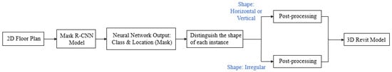 Some researchers combine the results of object detection and segmentation tasks on 2D drawings. Dodge et al. [] first utilized fully convolutional networks (FCN) to do wall segmentation after trying different pixel strides. They used the Faster R-CNN framework to detect 6 classes on the same images and optical character recognition (OCR) to estimate room size. Kippers et al. [] developed an approach that combined semantic segmentation with U-Net and object detection with Faster R-CNN on the floor plan. They obtained the outline of the floor plan as a contour after the semantic segmentation task. The combination of the simplified contour with object detection task result is used for arranging doors and windows. The previous studies combined the results of object detection and segmentation models to achieve the best performance of object recognition on the floor plan. On the other hand, the discussion of the differences between object detection and instance segmentation models is focused on in this study in terms of interoperability between artificial neural networks and prevailing 3D modeling software. The Fast R-CNN and Mask R-CNN models were selected for this study since they are widely used in practice and research [,,,].