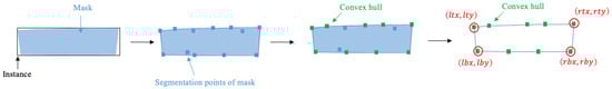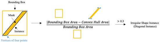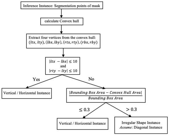 A pipeline was created in Figure 18 to distinguish the shape of each instance since different algorithms would be fed into it depending on its shape. Instances were sorted into horizontal, vertical, and irregular shape instances. To have a better understanding of the shape of an instance from its mask, a set of segmentation points, the convex hull points were calculated and the four vertices points, were extracted on the edges to represent each mask, as shown in Figure 19. The first shape identifier used the values from these four points to distinguish the shape. If Equations (5) and (6) were satisfied, the shape of the instance would be determined as either vertical or horizontal. However, if the two inequalities were not all satisfied, a second shape identifier was applied, which compared the four vertices with bounding box coordinates. Take an instance in Figure 19 as an example, both bounding box coordinates and four vertices of convex hull information for an instance existed. The area enclosed by the bounding box and convex hull were calculated separately. If Equation (7) was satisfied, the shape of the instance was determined as either vertical or horizontal. Otherwise, like the case in Figure 20, the shape of the instance was determined as diagonal. The 0.3 threshold in Equation (7) was determined through a trial-and-error process. This process is recommended to practitioners to decide the appropriate threshold for instance shape identification in their study.