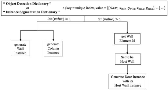At this point, two arrays were held: the “Object Detection Array” and the “Object Detection Post-Merging Array”. To reconstruct door instances in Revit 2022, their host wall needed to be specified, which means each door was embedded in a specific host wall. The proposed strategy was to append the door instances from “Object Detection Array” to “Object Detection Post-Merging Array” and set the index value of the doors (unique index, the first value of the array) to be the same as their host walls so that using a dictionary can pair them by their index as key later. To conduct this strategy, all instances were looped through in the “Object Detection Post-Merging Array” for each door instance in the “Object Detection Array” and fed into either horizontal or vertical instance operation.
