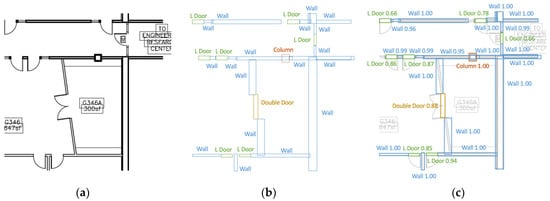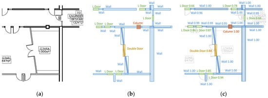 (a) Original floor plan; (b) wall instances annotation; and (c) L door, R door, double door, column instances annotation (Diverse color annotations are used to differentiate between various categories).