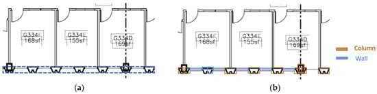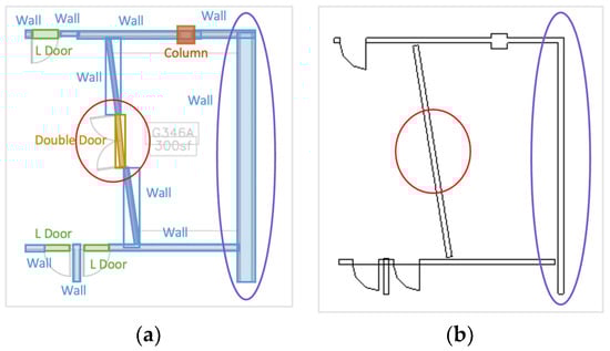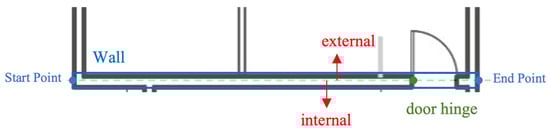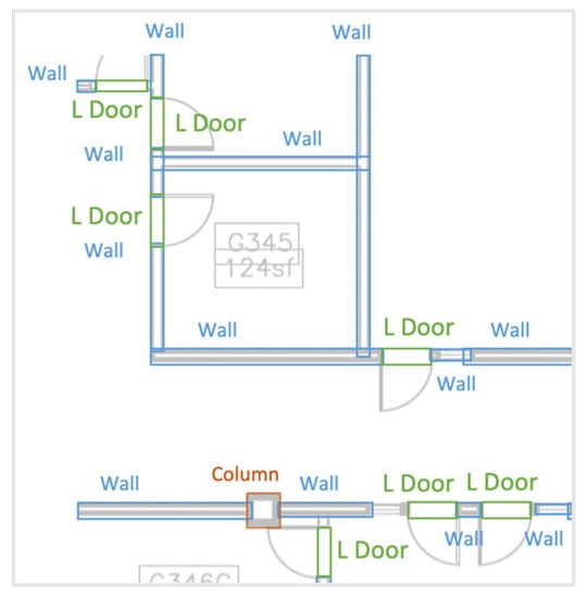 The requirements of 3D reconstruction in Revit 2022 for each class should be identified. The requirements were determined by the functions in Revit API 2022 Docs that were used. There are three kinds of reconstruction processes. The first one is to reconstruct wall instances that do not have any embedded instances (e.g., doors). Equation (1) is used to reconstruct the wall instances. Secondly, to reconstruct column instances, the wall and column should be modeled separately based on observation even if the column is embedded in the wall, as shown in Figure 10. Equation (2) is used to reconstruct column instances. The last one is to reconstruct the door instances which are embedded in their host walls. The host wall is reconstructed by Equation (1), and Id of the host wall is acquired from Equation (3). Equation (4) is then used to reconstruct single door or double door instances. The different door types are specified in the symbol attribute in Equation (4).