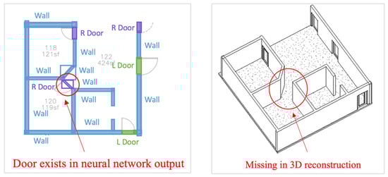 Isolated door instances. The post-processing algorithms in Section 3 could make the 3D digital reconstruction mostly align with the neural network output, as shown in Figure 34. For door instances creation in 3D modeling software, all door instances are assumed to be embedded in their host wall, so Equation (4) is used to generate all door instances in Revit 2022. However, the case falling out of this assumption is discovered, as shown in Figure 35. This door cannot be generated during the 3D reconstruction phase even if this door instance exists in the neural network output. The proposed advice is that the door instances without a host wall should be isolated during the post-processing phase, and there are two possible solutions. First, placing the isolated door by creating a custom door family rather than using Equation (4). Secondly, creating a wall with the same location, the value of , , , , as the isolated door, and set it to the host wall.