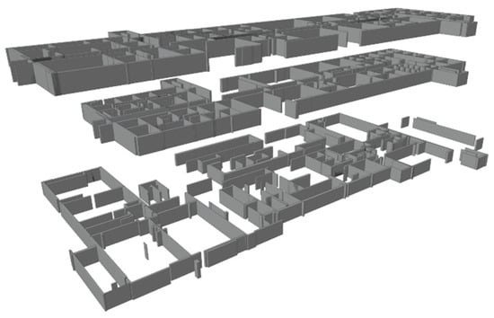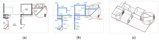3D modeling involves creating a mathematical, three-dimensional representation of an object, whether it is an inanimate item or a living entity. This is accomplished using dedicated software to manipulate edges, vertices, and polygons within a simulated 3D environment []. Researchers choose different 3D modeling software to reconstruct digital models from floor plans. For example, a study interested in indoor space modeling aimed to reconstruct Geography Markup Language (GML) models that could integrate, exchange, and store 3D geospatial data. Jang et al. [] generated vector output from deploying segmentation on original floor plan images. City Geography Markup Language level of detail 2 (CityGML LOD2) and Indoor Geography Markup Language (IndoorGML) 3D data models were created automatically.