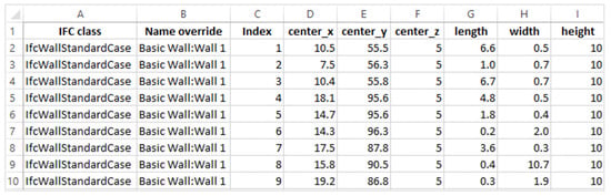 Instead of commercial 3D modeling software, such as Revit 2022, some users prefer to use open-source modeling software, such as Blender 3.6, due to its relative accessibility and flexibility. To explore the capabilities of interoperability for Blender 3.6, the wall detection output from our previous work is utilized [] in an attempt to create a 3D wall model. The neural network output is aggregated in a CSV file, as shown in Figure 41, and the coordinate system transformation and merging of adjacent wall instances post-process are conducted. However, the location and class representation of a 3D object in Blender 3.6 is different from Revit 2022. First, an instance in Revit 2022 is localized by giving its start point and end point, as shown in Figure 16, but the location of an instance is defined by giving its center point coordinates, length, width, and height for Blender 3.6, as shown in Figure 42. Secondly, the function is used to specify the instance class in Revit 2022, as discussed in Section 4, but the class of an instance is set by providing its IFC class. Thus, a CSV file is generated containing the IFC class, center point coordinates, length, width, and height for each instance, as shown in Figure 43. Finally, a script is written to read the information in a CSV file based on Blender 3.6 Python API and reconstruct the digital wall model in Blender 3.6, as shown in Figure 44.