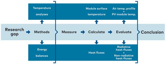 The topic has only recently gained importance in urban planning practices, and the theoretical assumptions have been investigated in few simulation-based and experimental studies [,]. Generally, the simulation-based studies (in urban environments) have identified a cooling effect of the PV modules on their surrounding thermal microclimate [,,], while metrological studies (in rural environments) have instead measured slight daytime heating effects [,,,]. In most of the studies, only surface, mean radiant and ambient air temperatures are analyzed [,,,,,,]. However, the temperature differences are marginal, and the results might be blurred due to simulation simplifications and measurement inaccuracies. Hence, some studies have established energy balances to gain insights into the physical processes leading to the temperature differences and to retrace the single radiative and non-radiative energy fluxes [,,,]. Only a few of these studies, however, have recently considered the downward convective heat transfer from the PV modules [,], while neglecting to consider it likely leads to an underestimation of convective heat transfer processes in the majority of studies.