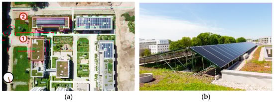 (a) Aerial view of the measurement site: 1 = reference roof, 2 = PV roof; (b) PV roof.