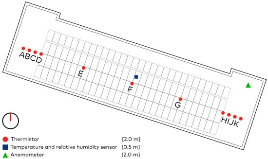 Positions of the anemometer, the temperature and relative humidity sensor and the thermistors (A–K) above and next to the photovoltaic installation (based on []).