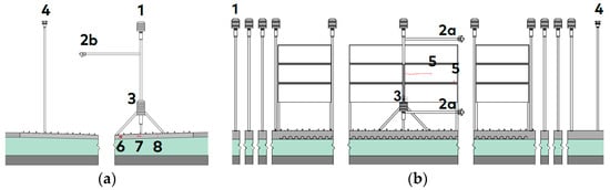 Measurement set-up (based on []) with 1–8 referring to the sensors listed in Table 2. (a) Reference roof; (b) PV roof (red line: the sensor mounted on the rear side of the PV module).