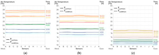 Ambient air temperature profile (monthly averaged) measured at a height of two meters above the reference roof (Tair,REF,2m) and the PV roof (Tair,PV,2m). (a) July (16th–31st); (b) August; (c) September.