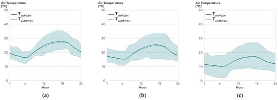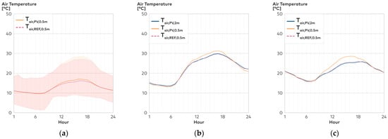 Hourly ambient air temperatures (monthly averaged) and minimum/maximum values measured centrally at the height of two meters above the reference roof (Tair,REF,2m) and the PV roof (Tair,PV,2m). (a) July (16th–31st); (b) August; (c) September.