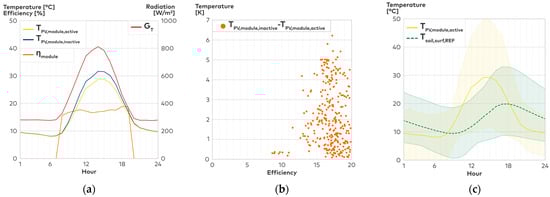 Figure 9a shows the module temperature of a PV module producing solar energy (TPV,module,active) and the temperatures of a module currently not producing solar energy (TPV,module,inactive) measured and calculated according to Equation (1). The analysis was conducted from 26 August to 30 September. Instead of being converted into heat, the generation of solar energy transforms part of the incident radiation into electricity. Hence, this energy is removed as electricity from the system. Consequently, as soon as solar radiation impinges on the surface and electricity is produced, the module temperatures of the active PV module are lower than those of the inactive module. The peak temperature difference in September (monthly average) amounts to −2.96 K at 1 p.m. with an absolute maximum of up to −6.22 K. In the morning and evening, the temperatures of both modules are identical. With increasing global radiation and hence, with increasing solar energy production, the temperature difference increases and reaches its peak in the afternoon. In the evening, the incident radiation and hence, the absolute amount of produced solar energy, is small. Therefore, even though the module efficiency reaches its peak at 6 p.m., the temperature difference amounts to −0.2 K.