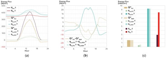 A photovoltaic module is designed to absorb a maximum amount of solar energy that can be transformed into electricity. Hence, the albedo of a PV module is low, leading to an intensified absorption of solar radiation during the day. The albedo is calculated by dividing the downwelling and upwelling shortwave solar radiation according to Equation (7) []: