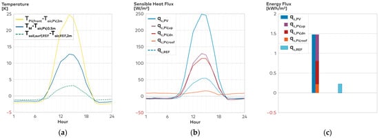 The application of photovoltaic modules on building envelopes alters the thermal energy balance of the surroundings via several effects [,,,]: The lower albedo in comparison to conventional building envelopes increases the share of absorbed radiation. Part of the absorbed radiation is converted into electrical energy, hence reducing PV module temperatures and consequently upwelling longwave radiation. Moreover, due to their lower heat storage capacity, PV modules rapidly heat up and release the stored heat faster than conventional building materials. Additionally, the installation of PV arrays adds a further layer to the energy balance that dissipates heat upwards and downwards via radiation and convection. The additional layer also provides shading and lowers the sky view factor of the surface beneath them, thus reducing nighttime cooling.
