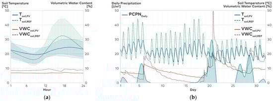 Due to sensor failure and replacement, the HygroVUETM5 mounted at the height of 0.5 m above the reference (Tair,REF,0.5m) and the PV roof (Tair,PV,0.5m)–hence beneath the PV modules sensors–stopped transmitting data on days with ambient air temperatures above 28 °C and in August. Therefore, we only have temperature data for the month of September and on some warm days in July (e.g., 13 July 2022 and 15 July 2022, as shown in Figure 8b,c).