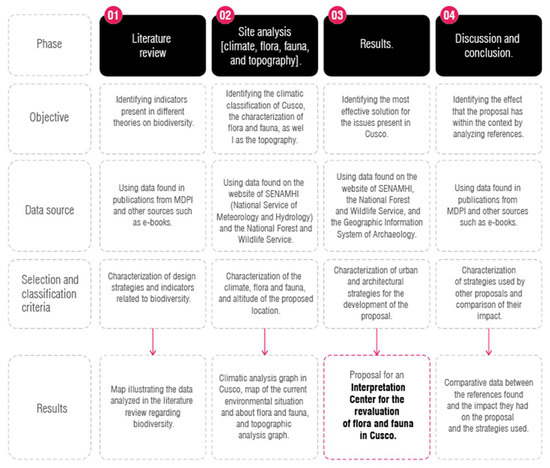 Figure 6 outlines the stages and process of the research, commencing with the review of information according to data sources, followed by characterization based on the presented subtopics, and the development of strategies to achieve an appropriate proposal aligned with the context at hand. In phase 2 for the development of the data and climate analysis, a database is used that is SENMAHI, which is the National Meteorology and Hydrology Service of Peru, it is a public body attached to the Ministry of the Environment whose objective is to generate information and meteorological, hydrological and climatic knowledge, in an accessible and truthful way for the benefit of the Peruvian population, operates with a national network of more than 900 meteorological and hydrological stations in accordance with technical standards of the World Meteorological Organization (WMO).