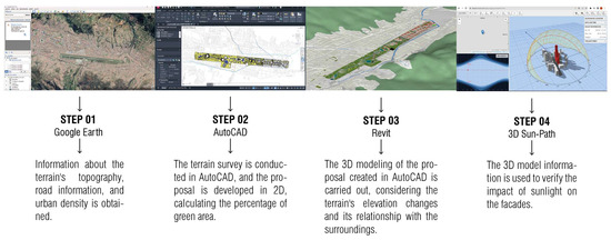 In Figure 7, the procedural steps essential for executing the proposal are delineated. The fundamental objective of this proposal is to establish spaces that actively foster the conservation of endemic species within the Cusco department. The initial step (Step 1) encompasses the acquisition of terrain data through Google Earth, providing crucial information pertaining to elevations and cross-sections of primary roadways. Transitioning to Step 2, an in-depth terrain survey is conducted using AutoCAD 2022, resulting in the delineation of road networks and axes. Notably, this phase also involves the conceptualization of an urban proposition in alignment with the fundamental tenets of the “Inca cosmovision”. Advancing to Step 3, subsequent to the conceptualization in AutoCAD, a sophisticated 3D model of the sanctuary and the interpretation center is actualized using Revit 2022. Finally, in Step 4, a comprehensive 3D Sun-Path 2023 analysis is executed to ascertain the solar influence on the facades and the efficacy of solar protection within the communal spaces intrinsic to the proposal.