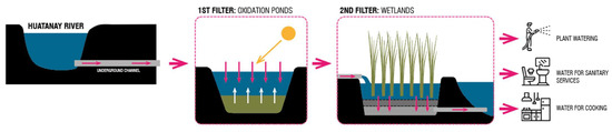 During Phase 1, 35% of the water is filtered. Subsequently, in Phase 2, the canal passes through artificial wetlands consisting of a bed filled with gravel and sand placed on an impermeable surface (clay) and macrophytic aquatic plants. In this phase, 80% of the water is filtered. Finally, during Phase 3, it undergoes a more extensive filtration process, which will have a final disposition for use in irrigating the preserved species. This system results in a reuse of 0.2 cubic meters of wastewater daily, reducing the pollution impact on the Huatanay River, as it receives a significant amount. The implementation of this wastewater treatment system will lead to pollution reduction.