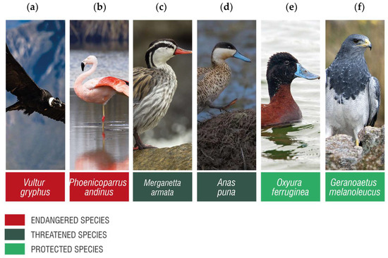 Endemic and migratory avifauna in Cusco (a) Vultur gryphus, reprinted with permission from Ref. [38], 2023, Marca Peru; (b) Phoenicoparrus andinus, reprinted with permission from Ref. [39], 2023, Mara Perù; (c) Merganetta armata, reprinted with permission from Ref. [40], 2023, Ebird; (d) Anas Puna, reprinted with permission from Ref. [41], 2023, Ebird; (e) Oxyura ferruginea, reprinted with permission from Ref. [42], 2023, Birds; (f) Geranoaetus melanoleucus, reprinted with permission from Ref. [43], 2023, Ebird.