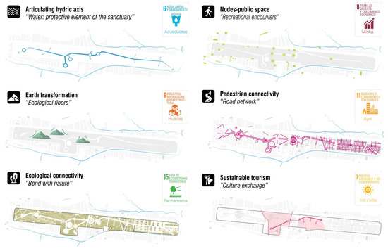 Furthermore, the relationship of these strategies with the Sustainable Development Goals (SDGs) was also considered, given their importance in creating a positive impact on the community. The concept used for the urban and architectural proposal is inspired by the organizational structure of the Inca Empire, as it is the reason for its significance in the world and its vision of the universe, known as the “Andean worldview”. The foundation of the Inca Empire is based on four principles: transformation, collectivity, essence, and reciprocity [32]. Furthermore, the relationship of these strategies with the Sustainable Development Goals (SDGs) was also considered, given their importance in creating a positive impact on the community (Figure 15).