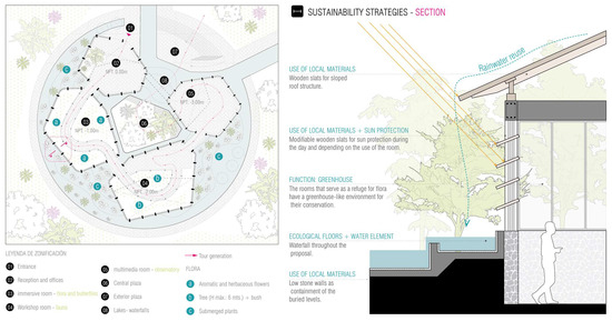 The architectural proposal incorporates various sustainability strategies, primarily the reuse of rainwater for the wetlands created within the design. This harvested rainwater will be employed for irrigating interior plants located in greenhouses and the plaza, as well as supplying the necessary water for services. Additionally, the use of local materials and construction techniques, such as stone walls to enhance thermal mass and wooden lattices for solar protection and ventilation, is another noteworthy aspect of the proposal.