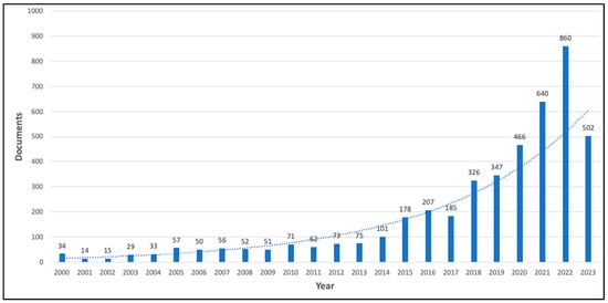 The dataset used in this study consisted of 3710 scholarly publications published between 1 January 2000 and 8 July 2023. These publications were sourced from 148 countries and involved 9567 authors, 1214 organizations, and 937 publishing sources (Table 1).