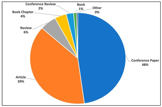 The search task of literature data was conducted in July 2023 by covering the publication between 1 January 2000 to 8 July 2023—covering over two decades of publications on the topic. Excluding the small number of publications with information absence—i.e., undefined document type and authors—the search resulted in selected a total of 9564 publications from Scopus repositories, including conference papers, articles, conference reviews, book chapters, and gray literature. It is noted that journal papers are extended, structured pieces published in journals, while a conference paper is a concise, focused work presented at conferences. After extracting the papers from the database, they were carefully checked for completeness and screened to remove any publications that did not meet the inclusion criteria. The primary criteria for inclusion in this study were articles that described or evaluated practical applications of AI subfields and techniques in the construction industry, based on information from the abstract, title, or full-text article when needed. Data extracted from each article included the application area in construction, the methodology/techniques used, and the findings.