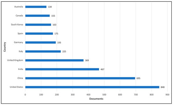 The main types of selected publications are conference papers (47.8%) and articles (38.7%). Other gray literature such as reviews, book chapters, and others only account for 4% of the total number of publications (Figure 2). The major subject areas of selected publication are Engineering (n = 44.9%), Computer Science (n = 24.1%) and Mathematics (5.6%) (Figure 3). USA (n = 1791), China (n = 1289), and India (n = 794) are the top three productive countries, which, respectively, account for 39.9%, 28.7%, and 17.7% of the total publications (Figure 4). Despite excelling in AI across various sectors, Japan’s absence from the top 10 AI research publishers in construction could stem from its broader AI focus, including robotics, electronics, and manufacturing. The construction sector’s distinct challenges might have influenced Japan’s research distribution despite its AI leadership.