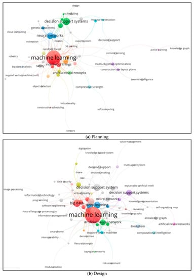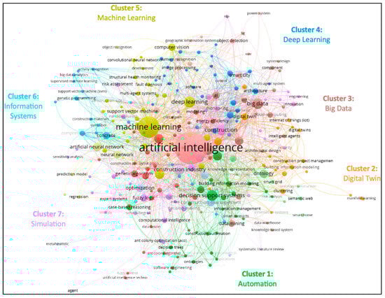 VOSviewer is a widely used software tool designed to visualize and analyze bibliometric networks. Allowing researchers to comprehend intricate relationships and trends within the extensive scholarly literature. By processing bibliographic data encompassing publication records, citations, and keywords, VOSviewer creates visual representations that unveil connections and patterns among different elements in the dataset []. It achieves this by constructing networks of nodes (authors, keywords, journals) and edges (co-citation or co-occurrence relationships), arranging them in the visualization space based on their associations. This interactive visual map facilitates the identification of key authors, influential papers, collaboration trends, and emerging research areas []. VOSviewer has become a popular tool for scientometric research in various fields, including thermal comfort and building control [], sustainable urban development [], circularity in construction [], autonomous vehicles [], and smart homes []—just to name a few. In this study, VOSviewer was used to analyze AI in construction literature and create a range of visual diagrams, such as co-authorship network maps, citation-based network maps, and co-occurrence network maps, to help visualize and qualitatively analyze the literature data [].