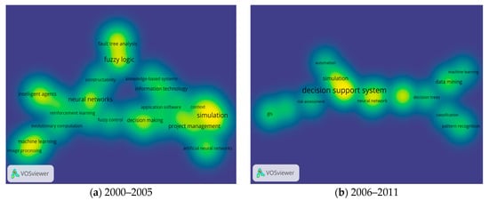 Second, on the density map of 2006 to 2011, the largest aggregation is composed of Cluster 3 (Big Data) and Cluster 7 (Simulation) (Figure 8b). Furthermore, some keywords from Clusters 3 and 5 first appear on the map with higher density, i.e., neural networks, data mining, and machine learning. In this period, Cluster 1 (n = 4), Cluster 2 (n = 1), Cluster 3 (n = 1), Cluster 5 (n = 1), and Cluster 7 (n = 3) occupy the top-10 occurrence keywords list as seen in Table 9.