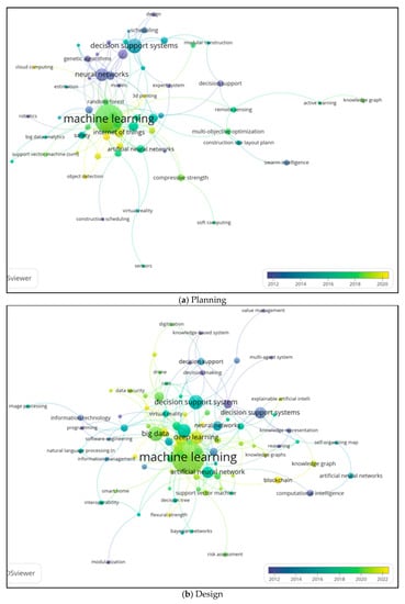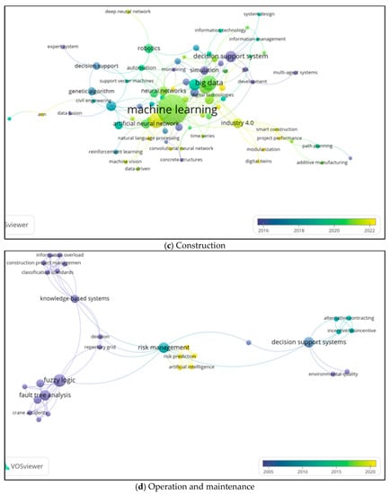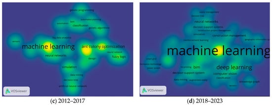 This subsection identifies historical research-based keyword occurrences on a density map in the context of AI in construction. The keyword selection process excluded redundant keywords and alternative keywords to provide a more explicit understanding of the specific research clusters and extended research orientation of AI in construction.