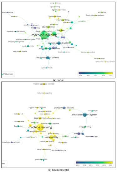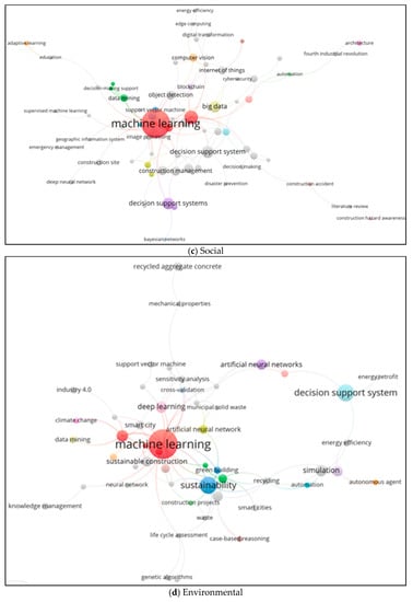 As a result of this screening process, a final selection of 3710 publications was considered relevant and included for further investigation. From these screened papers, the publications were sorted based on the author keywords and abstract into the four pillars of sustainability, namely: (a) economic; (b) social; (c) environmental; and (d) governance, as well as into different project phases, such as: (a) planning; (b) design; (c) construction; and (d) operation and maintenance. After the search task was completed, full records of the resulting publications, including citation and bibliographical information, abstracts, keywords, funding details, and other relevant data were exported in CSV format. This format was chosen to ensure compatibility with the selected data analysis software, namely VOSviewer [].