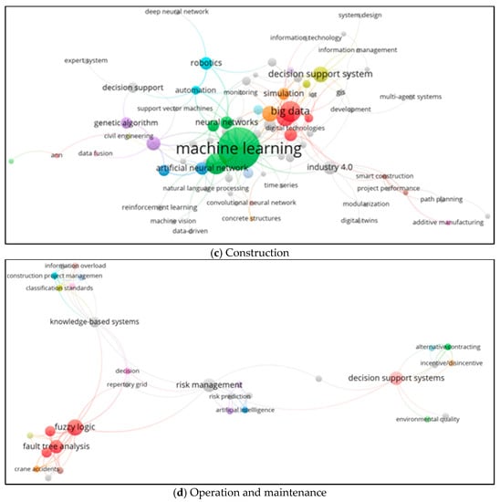 This study presents a comprehensive scientometric analysis of 3710 published papers on AI in construction over the past two decades with a particular angle from sustainability and construction phases. By examining the existing literature, this study provides an updated and concise overview of the field’s knowledge structure and evolution. The findings reveal a progression from basic automation to more advanced neural network platforms, with a strong focus on machine learning, deep learning, big data, and IoT. The concept of AI in construction has expanded over time, encompassing emerging technologies such as natural language processing, virtual reality, and augmented reality []. The integration of intelligent systems and algorithms has shown great potential in improving productivity, efficiency, safety, and sustainability within the construction industry []. As technology continues to advance, AI is expected to play an even larger role in driving innovation and transforming traditional construction practices [,,,].