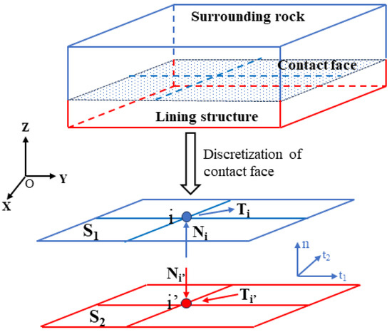 Taking the contact model of the surrounding rock and lining structure as an example, as shown in Figure 1, the contact system is discretized by finite elements, and the discretized meshes on the contact surfaces of different media are the same, generating one-to-one corresponding node pairs, and the dynamic contact forces on the node pairs are equal in magnitude and opposite in direction [37,38]. The differential equation of motion for a node in a node pair is: