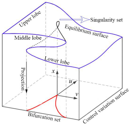 It is a three-dimensional continuous surface with internal folding in the three-dimensional coordinate system, including the upper, middle, and lower lobes, as shown in Figure 2. The position of the equilibrium point in the middle lobe is the location of the extreme value of the potential function , which is difficult to exist according to the principle of minimum potential energy for system stability, so the middle lobe is again the unreachable region of the potential function. The equilibrium point in the upper and lower lobes is the location of the minima of the potential function, whose equilibrium state is stable. Thus, the potential function mutation occurs at the locations where jumps occur in the upper and lower lobes, i.e., at the boundary lines of the middle lobe. When the equilibrium point jumps abruptly from the boundary of the upper lobe to the lower lobe or from the boundary of the lower lobe to the upper lobe at these junctions, the system is considered to have undergone a sudden change. These points, which lie on the boundary, satisfy the equation: